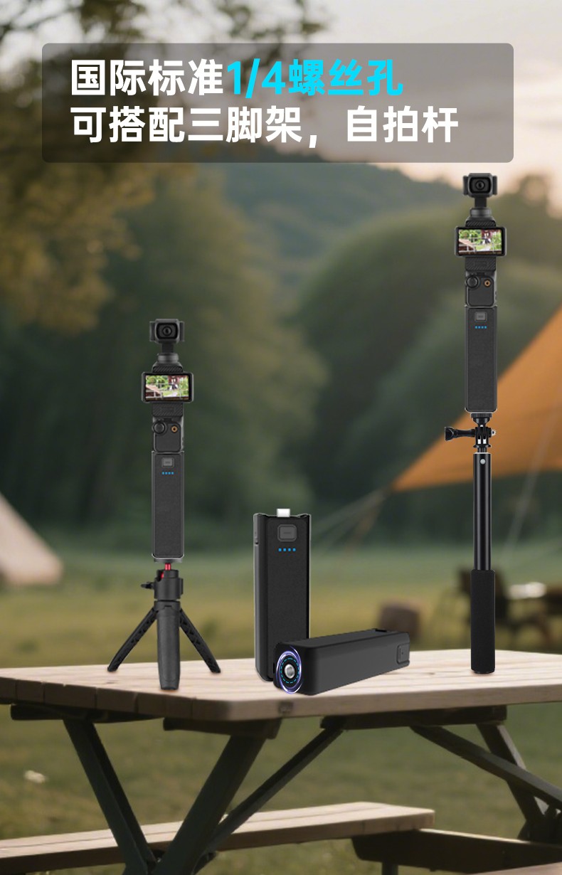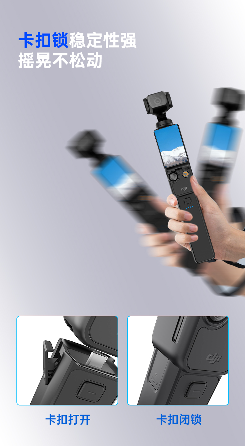 品名与编号:RSX-472 Pocket3 手柄充电器 1.两侧各有一个弹力锁扣,可将Pocket 3相机插入USB口,可给相机充电又便于操作。 2.安装上1/4转接头,可把运动相机和小型设备安装上去,当做手柄支架使用。