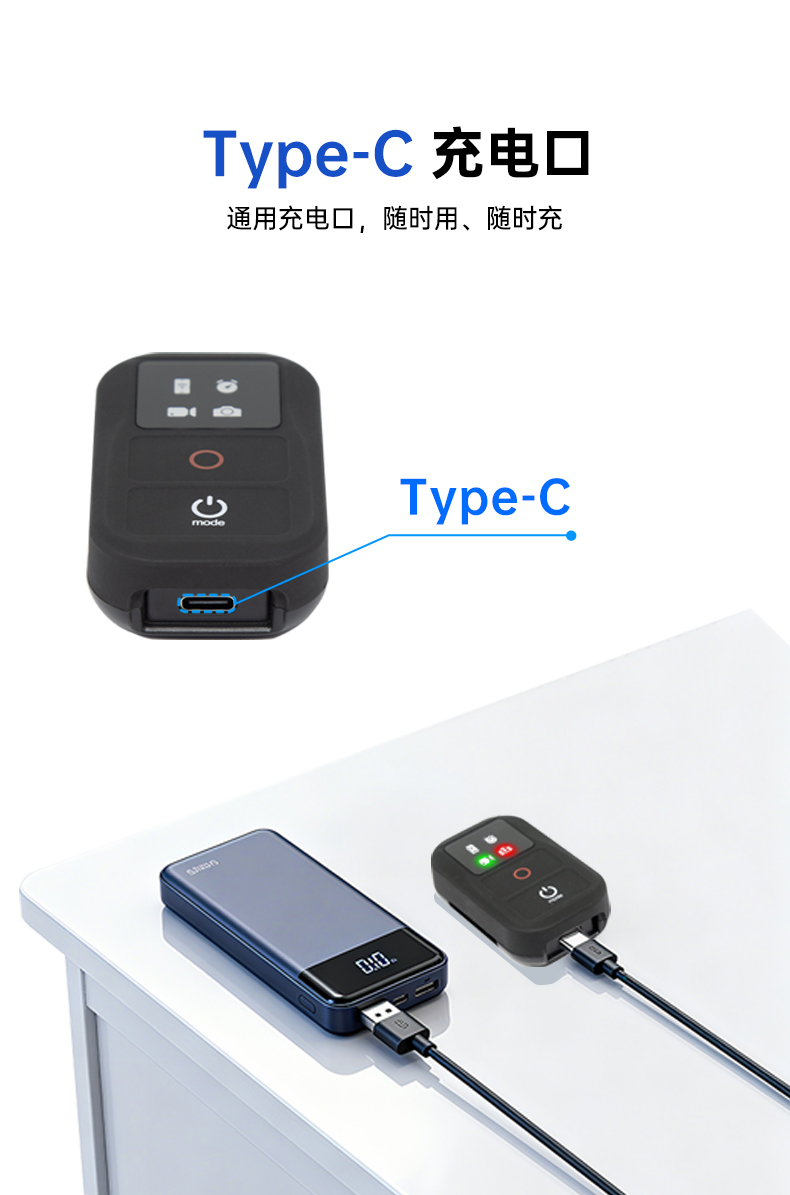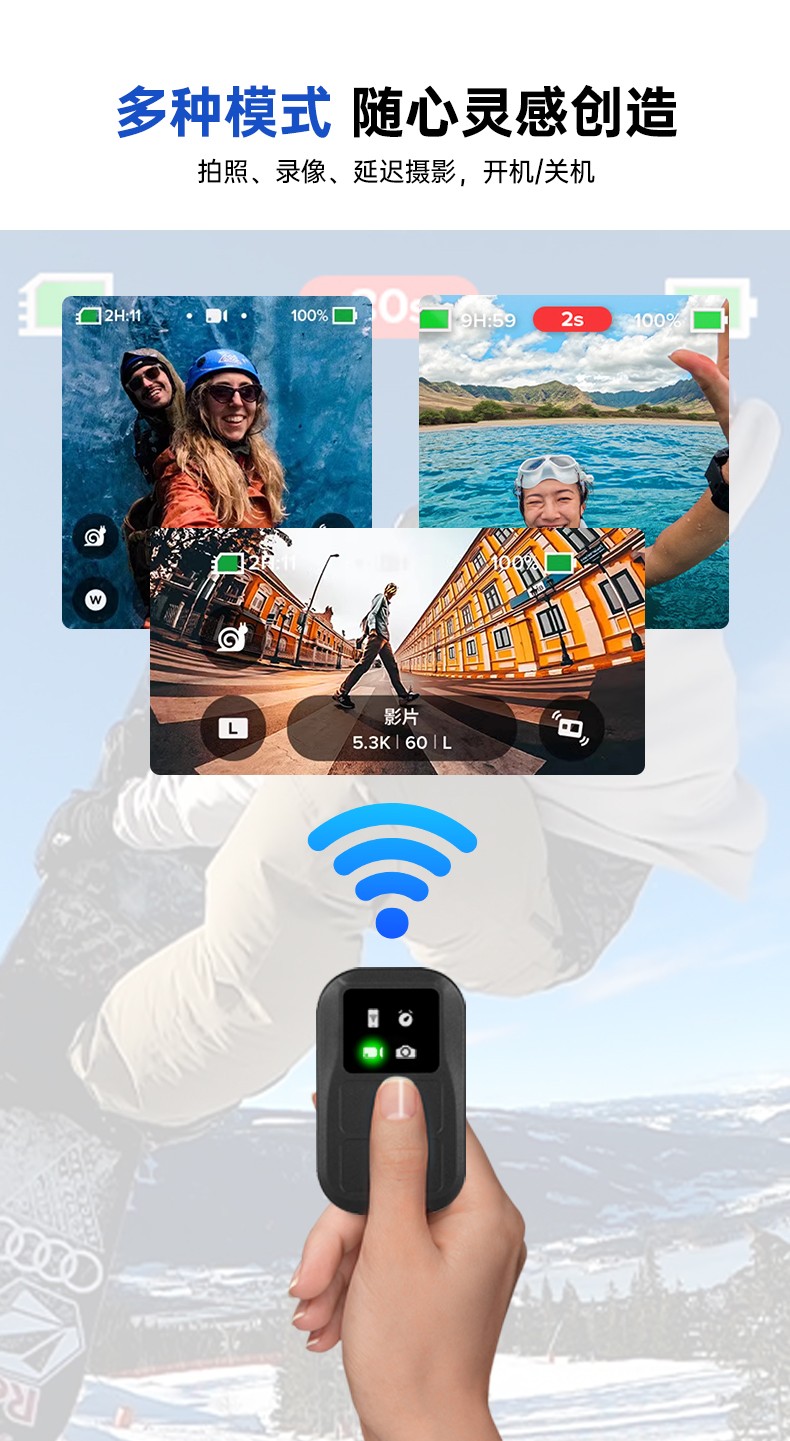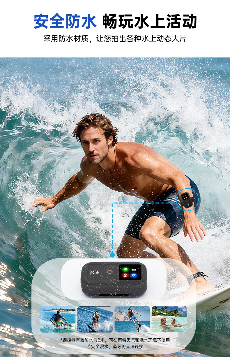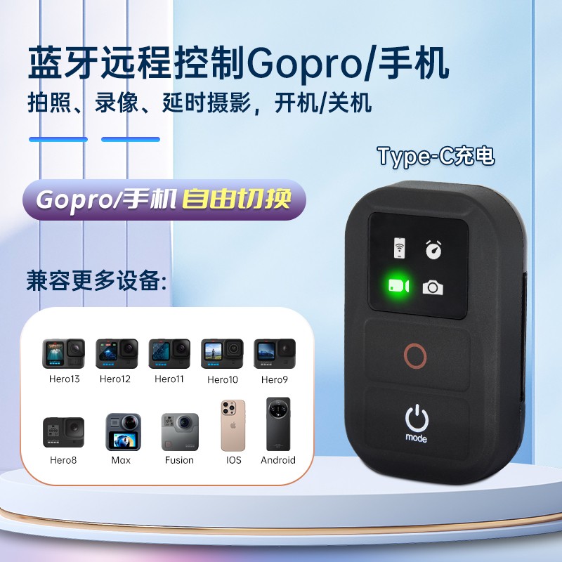 编号与品名:RSX-464 GoPro/蓝牙遥控器 此产品适用于GoPro 13/12/11/10/9/8/GoPro MAX/GoPro Fusion 运动相机及手机上。 遥控器防水2米,可在雨雪天气的环境下使用,若完全浸水,蓝牙将无法连接。